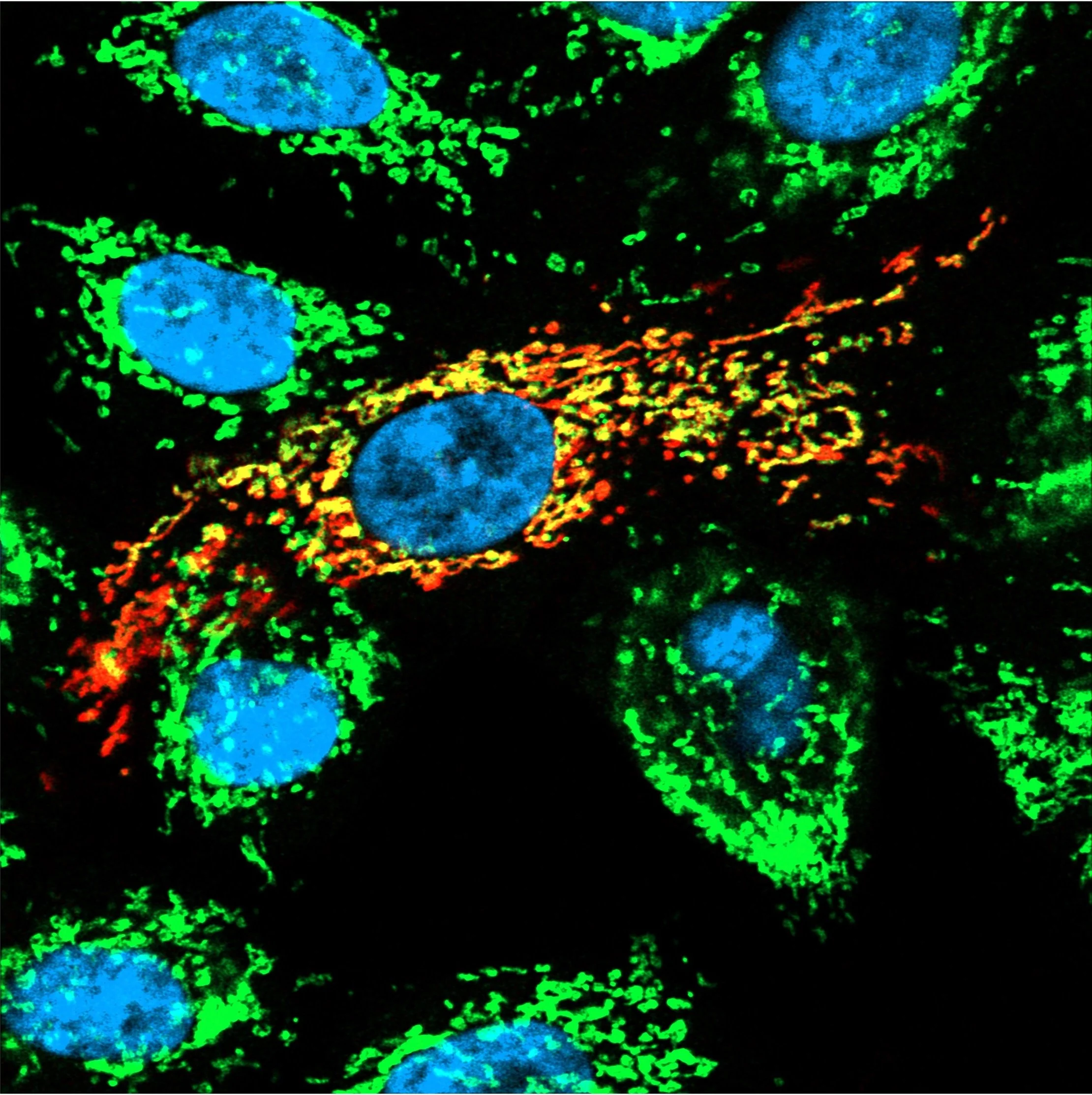 The image on the right was taken using super-resolution confocal microscopy. Mitochondria in human mammary epithelial cells were labelled using two different methods: introduction of a fluorescently labelled mitochondrial protein (red); and antibody staining of a mitochondrial protein (green). Cell nuclei were labelled with a fluorescent dye (blue).